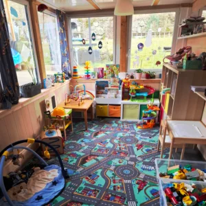 Da wir in unserem Garten noch keine Spielgeräte haben nutzen wir den Spielplatz von der Gemeinde. Auf dem Weg zum Spielplatz können die kleinen Kinder im Bollerwagen, angeschnallt, sitzen und die grösseren neben her laufen.
